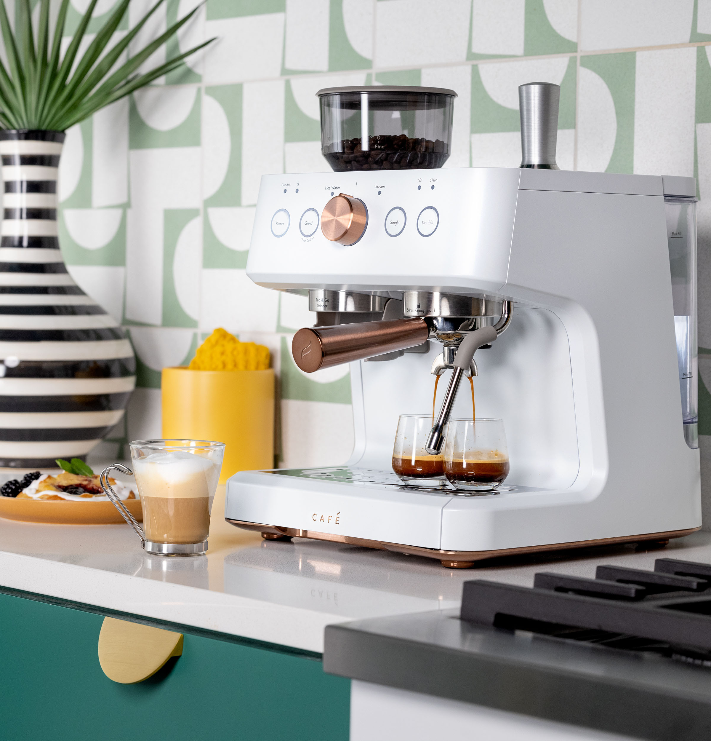 Cafe Bellissimo Semi-automatic Espresso Machine with Frother Product Details: Matte White The award-winning Café Bellissimo Semi-Automatic Espresso Machine is designed for espresso pros who want easy brewing while still having complete control over the shot. This smart espresso machine that syncs with the SmartHQ app, allowing you to customize drink preferences by volume and strength. … Café Bellissimo Semi Automatic Espresso Machine + Frother
