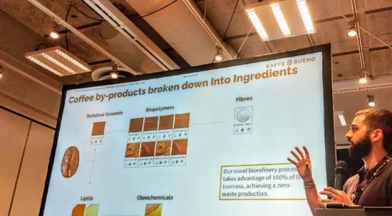 Alejandro Franco, CCO of Kaffe Bueno, discusses upcycling solutions in the lecture “Circular Economy: (Re)Generating Value Throughout the Coffee Circle.“ Photo by Isabelle Mani.