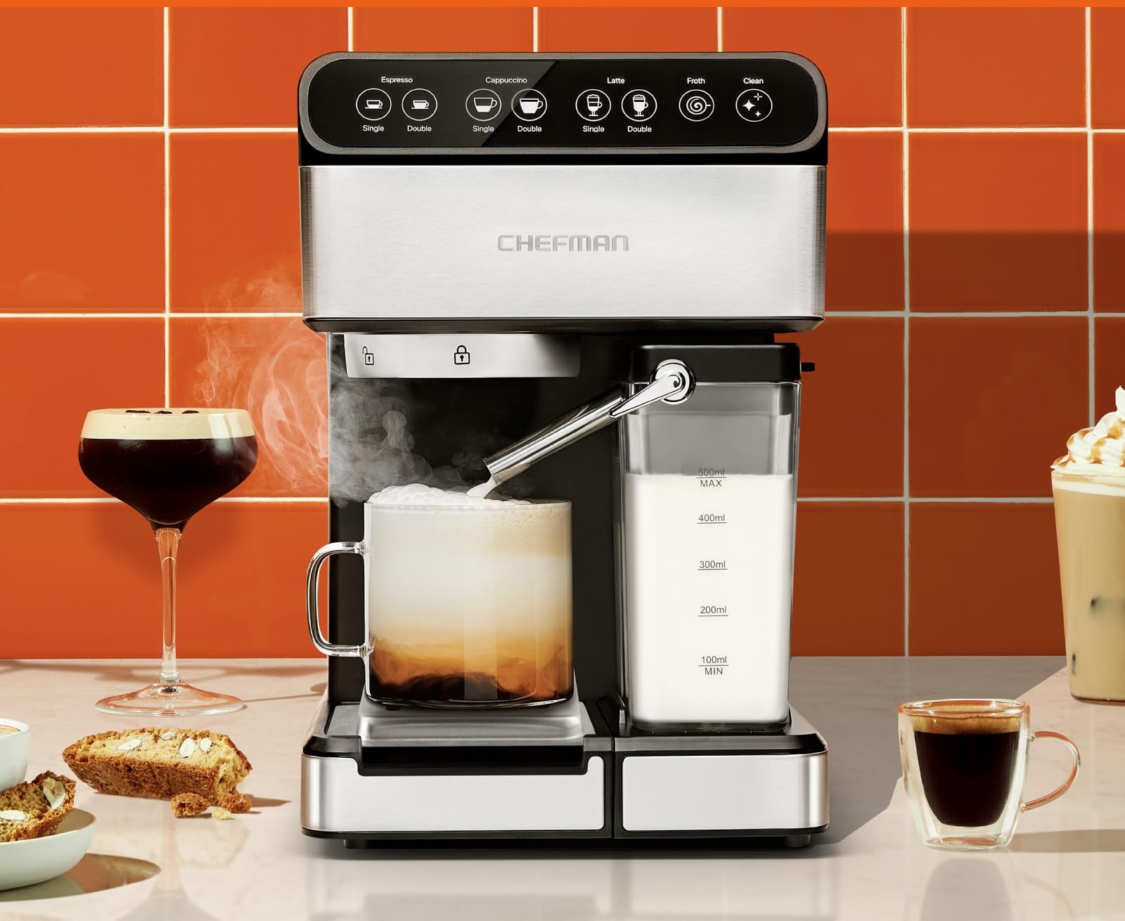 Discover the best way to brew your coffee shop ritual right in your kitchen. The Chefman Espresso Machine is the premium coffee brewer you’ve been missing. This 6-in-1 espresso machine features a one-touch button for single and double espresso, cappuccino, and lattes, plus a built-in frothing mechanism for custom drinks at home. Learn to create beautiful flat whites, mocha, macchiato, caffé Americano, and energizing beverages.