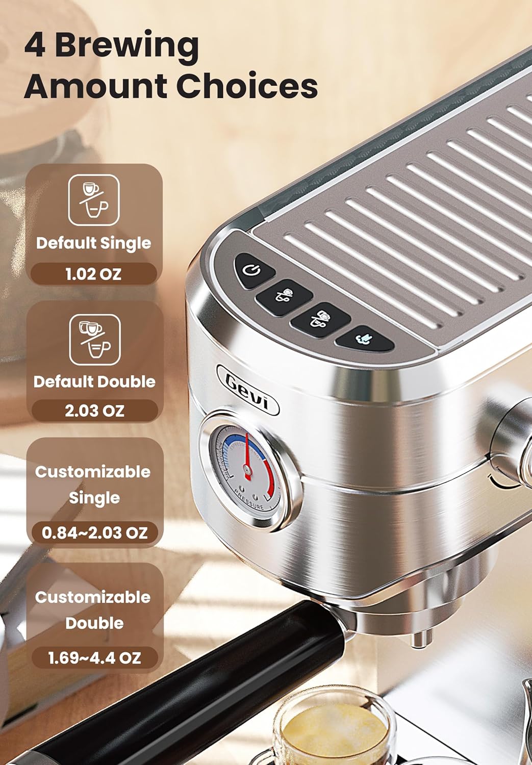 Equipped with an NTC temperature system, Gevi 20 bar espresso machines for home controls the temperature of espresso and frothing separately, ensuring a perfect balance between espresso flavor and rich milk foam. Full Stainless steel housing, stylish and durable, offering modern aesthetic that complements any kitchen decor. Additionally, the cappuccino machine’s compact design makes it fit on any countertops.