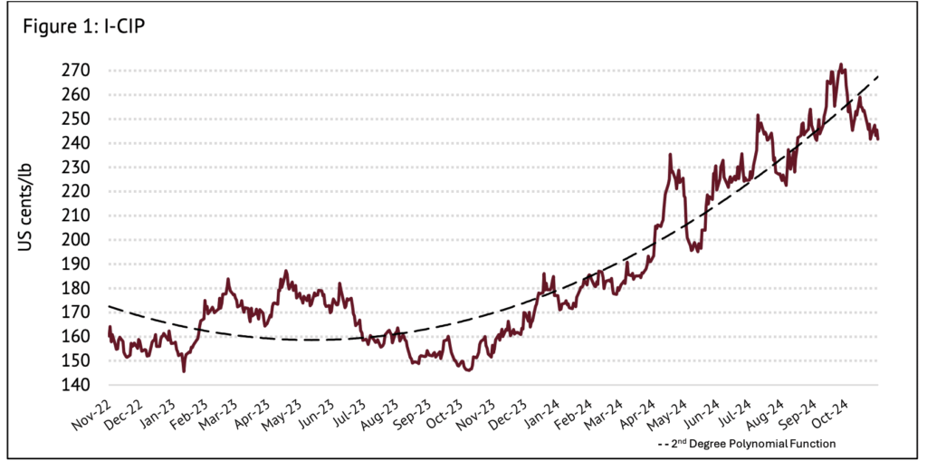 The International Coffee Organization’s (ICO) October 2024 report reveals its Composite Indicator Price (I-CIP) averaged 250.56 US cents per pound in October, a 3.2 per cent decrease from September.