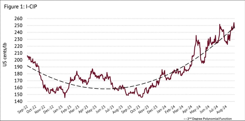 The I-CIP grew steadily and followed a consistent uptrend throughput August 2024 and peaked on 28 August at 254.12 US cents per pound. The Colombian Milds and Other Milds increased by 2.3 per cent and 1.7 per cent, reaching 263.76 and 261.44 US cents per pound, respectively..